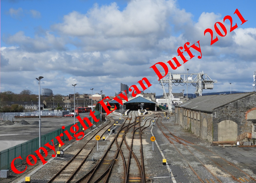 On the Down side, there was a container terminal which contained a goods store, loading bank, gantry and a number of loop sidings. The Markets tramway, opened in 1863, diverged on the Down side from this area. Closed in sections, the final part of this line was closed in 1961. Until 1975, a direct curve connecting the Foynes branch to the station, diverged on the Up side. The signal cabin is at the Rosslare end of platform 1 & 2. On the Up side of the station is a bus station and depot.