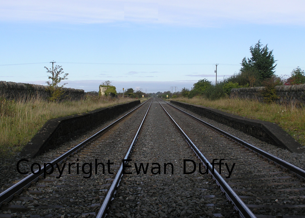 Closed in 1965, the platforms here are derelict. The station building was on the Up platform, behind which was the goods area containing a cattle bank and a store. Opposite, there were further sidings. The River Cusher is crossed at the Belfast end of station, the line